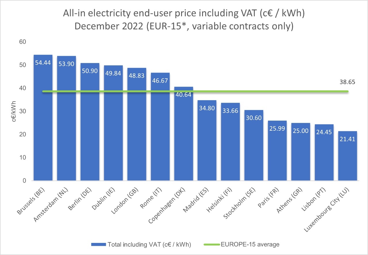 Τον Δεκέμβριο στην Ελλάδα η μέση τιμή της κιλοβατώρας διαμορφώθηκε στα 25 λεπτά, πολύ πιο κάτω από τον ευρωπαϊκό μέσο όρο, ο οποίος ήταν στα 38,65 λεπτά αλλά και από χώρες με ώριμες αγορές ενέργειας όπως η Ισπανία (34,8 λεπτά), η Ιταλία (46,6 λεπτά), η Βρετανία (48,8 λεπτά), η Γερμανία (50,9 λεπτά) κλπ.