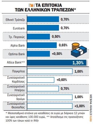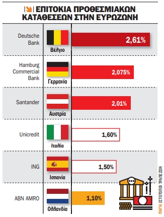 Παρ’ όλα αυτά, τα καταθετικά επιτόκια στην Ελλάδα παραμένουν κάτω από το μισό των αντίστοιχων επιτοκίων που προσφέρουν τα ευρωπαϊκά πιστωτικά ιδρύματα, γεγονός που αποτυπώνει απροθυμία του εγχώριου κλάδου να προσαρμοστεί στις νέες πιστωτικές συνθήκες στην Ευρωζώνη.