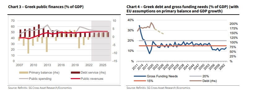 Επιπλέον, χάρη στις μεταρρυθμίσεις που εφαρμόστηκαν στον απόηχο της κρίσης, η Ελλάδα κατάφερε να βελτιώσει διαρθρωτικά τα έσοδά της. Καθώς οι δημόσιες δαπάνες διατηρήθηκαν υπό έλεγχο, αυτό επέτρεψε στην Ελλάδα να δει μεγάλα πλεονάσματα πρωτογενούς ισοζυγίου πριν από την πανδημία. Η SocGen αναμένει ότι αυτό θα συνεχιστεί από το 2023 και μετά. Τα πρωτογενή πλεονάσματα σε συνδυασμό με την περιορισμένη αύξηση στα κόστη εξυπηρέτησης του χρέους και την ισχυρή ανάπτυξη της οικονομίας αναμένεται να επιτρέψουν την περαιτέρω μείωση του δημόσιου χρέους τα επόμενα πέντε χρόνια, όπως προσθέτει.