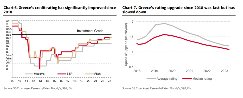 Η συνεχής βελτίωση των οικονομικών και δημοσιονομικών μετρήσεων θα πρέπει σχεδόν να εγγυηθεί την επιστροφή της αξιολόγησης της Ελλάδας στην επενδυτική βαθμίδα το αργότερο μέχρι το τέλος του 2024, εκτιμά η SocGen. Το πιο πιθανό χρονοδιάγραμμα είναι στο τέλος του 2023. Οι οίκοι αξιολόγησης γενικά ακολουθούν μια προσεκτική προσέγγιση κατά την αναβάθμιση και για να αποφευχθεί η αστάθεια και οποιαδήποτε αντιστροφή των προηγούμενων αξιολογήσεων, πρέπει να γνωρίζουν τυχόν πιθανούς κινδύνους. Οι βουλευτικές εκλογές του Μαΐου είναι ένας κίνδυνος που θα μπορούσε να περιπλέξει τα πράγματα.