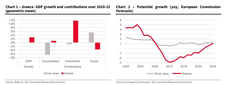 Ειδικότερα, όπως τονίζει η Société Générale, η ελληνική οικονομία ξεπέρασε σε επιδόσεις όλες τις χώρες της ευρωζώνης καταγράφοντας ισχυρή ανάκαμψη μετά την COVID-19, με το επίπεδο του ΑΕΠ να κινείται 6,5% πάνω από το επίπεδο πριν από την πανδημία (έναντι 2,5% για τη ζώνη του ευρώ). Οι κύριοι λόγοι για αυτή την υπεραπόδοση είναι: 1) μια αποτελεσματική δημοσιονομική απάντηση (η μεγαλύτερη στη ζώνη του ευρώ το 2020-21 σύμφωνα με το ΔΝΤ) και 2) το δυναμικό ριμπάουντ μετά την COVID και τα αρκετά χρόνια αδυναμίας μετά τη χρηματοπιστωτική κρίση, οι διαρθρωτικές μεταρρυθμίσεις και η ισχυρή ανάκαμψη του τουρισμού. Παράλληλα, η κατανάλωση και οι επενδύσεις συνέβαλαν σημαντικά στην υπεραπόδοση της Ελλάδας.