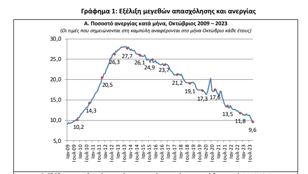 Στο 9,6% διαμορφώθηκε το εποχικά διορθωμένο ποσοστό ανεργίας τον Οκτώβριο του 2023 9,6% έναντι 11,8% τον Οκτώβριο του 2022 και του αναθεωρημένου προς τα άνω 10,3% τον Σεπτέμβριο του 2023.