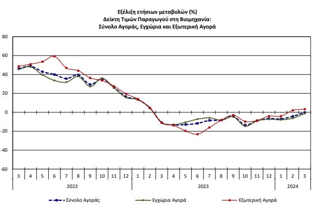 Μείωση 0,1% κατέγραψε ο γενικός δείκτης τιμών παραγωγού στη Βιομηχανία τον Μάρτιο του 2024 έναντι μείωσης 10,9% που σημειώθηκε κατά την αντίστοιχη σύγκριση των δεικτών του έτους 2023 με το 2022.