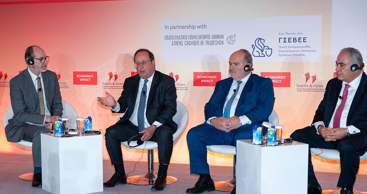 Στην ομιλία του ο πρώην Πρόεδρος της Γαλλίας Φρανσουά Ολάντ μίλησε για μία νέα τάξη πραγμάτων η οποία απαιτεί νέα μορφή δράσης από την Ε.Ε., τονίζοντας ότι το πρόβλημα της Ευρώπης σήμερα είναι πρωτίστως γεωπολιτικό. Παράλληλα εκτίμησε ότι σε πανευρωπαϊκό επίπεδο υπάρχουν διαθέσιμα αποταμιεύσεων τα οποία δεν αξιοποιούνται επαρκώς και αποτελεσματικά για τη χρηματοδότηση επενδύσεων και ενθάρρυνε τις νομοθετικές πρωτοβουλίες της Ε.Ε. που θα διευκολύνουν προς αυτήν την κατεύθυνση.