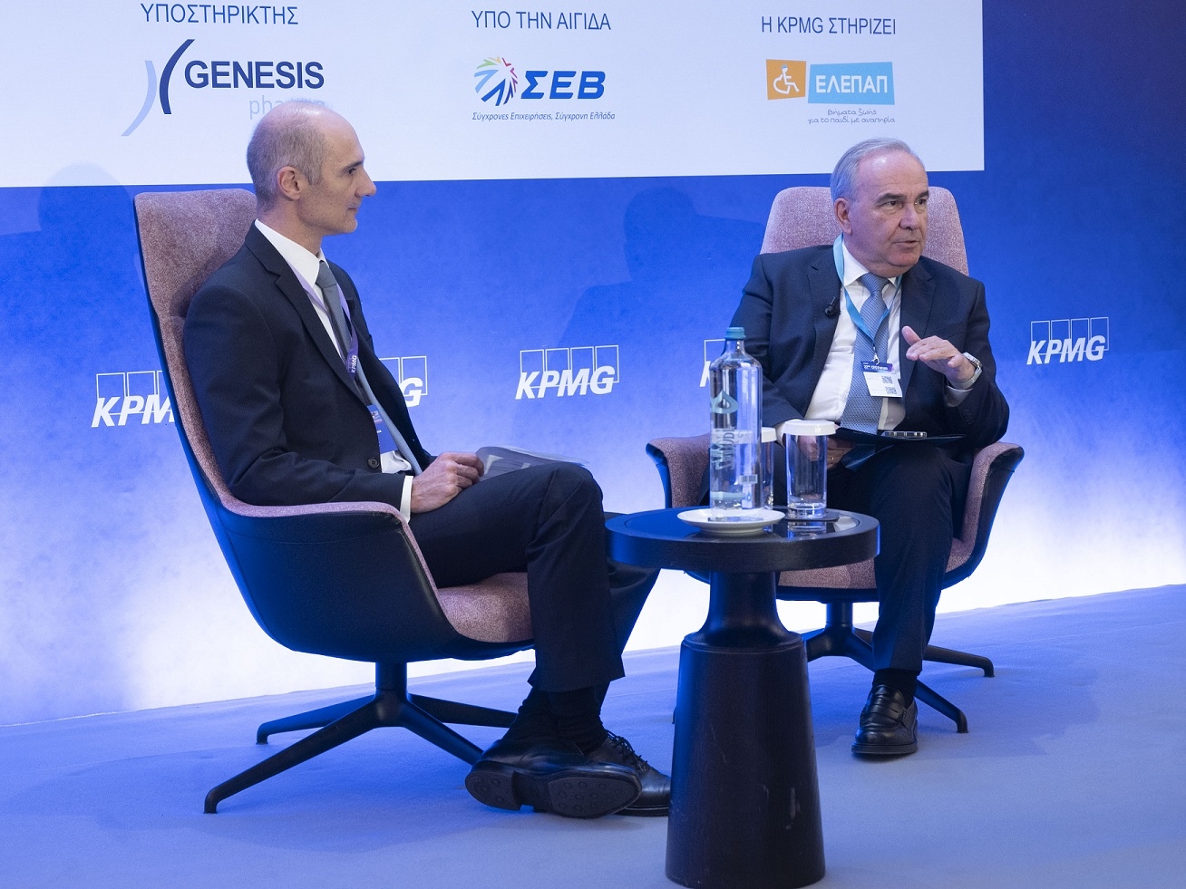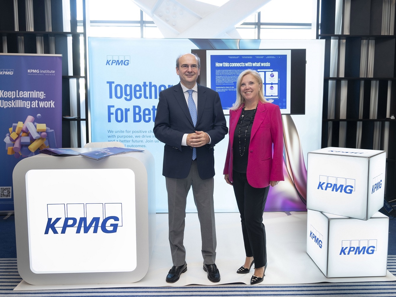 Από αριστερά Κωστής Χατζηδάκης, Υπουργός Εθνικής Οικονομίας και Οικονομικών της Ελλάδας, Μαρίνα Καπετανάκη, Partner, Head of Advisory, KPMG στην Ελλάδα