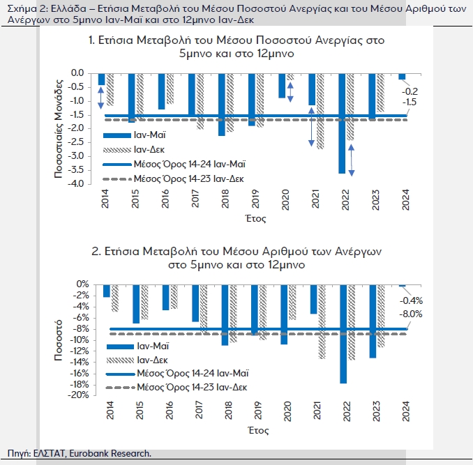 Επιπρόσθετα, με εξαίρεση το 2014 -έτος στο οποίο ξεκίνησε η μείωση του ποσοστού ανεργίας- και την 3ετία 2020-2022 (ισχυρές επιδράσεις από την πανδημία), σε όλα τα υπόλοιπα έτη, ήτοι το 2015, το 2016, το 2017, το 2018, το 2019 και το 2023, η μέση ετήσια πτώση του ποσοστού ανεργίας στο 5μηνο Ιαν-Μαϊ ήταν πολύ κοντά στο τελικό μέγεθος για το σύνολο του έτους. Αυτό το στοιχείο αποτελεί μια ένδειξη ότι το ποσοστό ανεργίας το 2024 ίσως μειωθεί βραδύτερα σε ετήσια βάση σε σύγκριση με τα προηγούμενα έτη, κάτι που αποτυπώνεται και στις τρέχουσες εκτιμήσεις επίσημων οργανισμών.