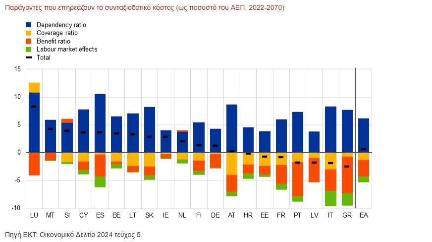 Λήψη μέτρων για την αποφυγή τυχόν δημοσιονομικού εκτροχιασμού στα συνταξιοδοτικά συστήματα των κρατών της Ευρωζώνης, εξαιτίας των πιέσεων που θα δεχτούν οι εθνικοί προϋπολογισμοί από το κόστος γήρανσης, εισηγείται η Ευρωπαϊκή Κεντρική Τράπεζα σε ανάλυσή της για τις επιπτώσεις του δημογραφικού προβλήματος, και με την πρόβλεψη ότι η Ελλάδα θα είναι η χώρα όπου ο δείκτης παροχών θα μειωθεί περισσότερο σε σχέση με τα υπόλοιπα κράτη, για να αντιμετωπιστεί το κόστος γήρανσης.
