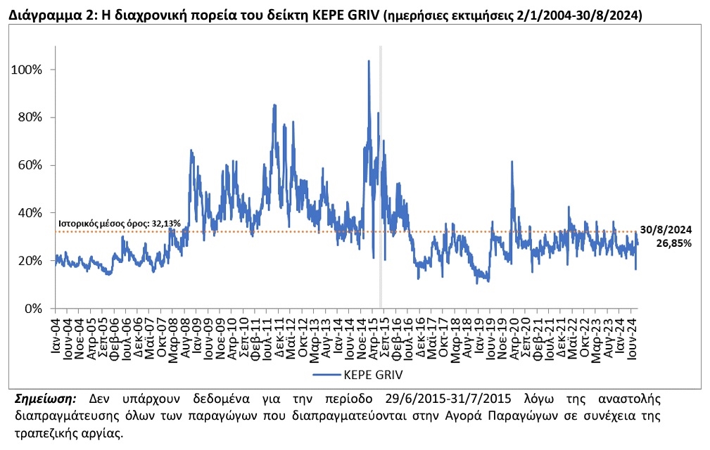 Ειδικότερα, ο δείκτης τεκμαρτής μεταβλητότητας KEPE GRIV, που αποτυπώνει την αβεβαιότητα των συμμετεχόντων στην αγορά παραγώγων και υπολογίζεται στη βάση των τιμών των δικαιωμάτων προαίρεσης του δείκτη FTSE/X.A. Large Cap, αυξήθηκε τον προηγούμενο μήνα, φτάνοντας το 26,85% στις 30/8/2024 από 23,09% στις 31/7/2024.