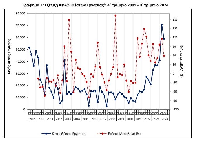 Ετήσια αύξηση κατά 58,8% κατέγραψαν οι κενές θέσεις εργασίας στο β' τρίμηνο του 2024 έναντι αύξησης 36,2% κατά την αντίστοιχη σύγκριση του έτους 2023 προς το 2022.