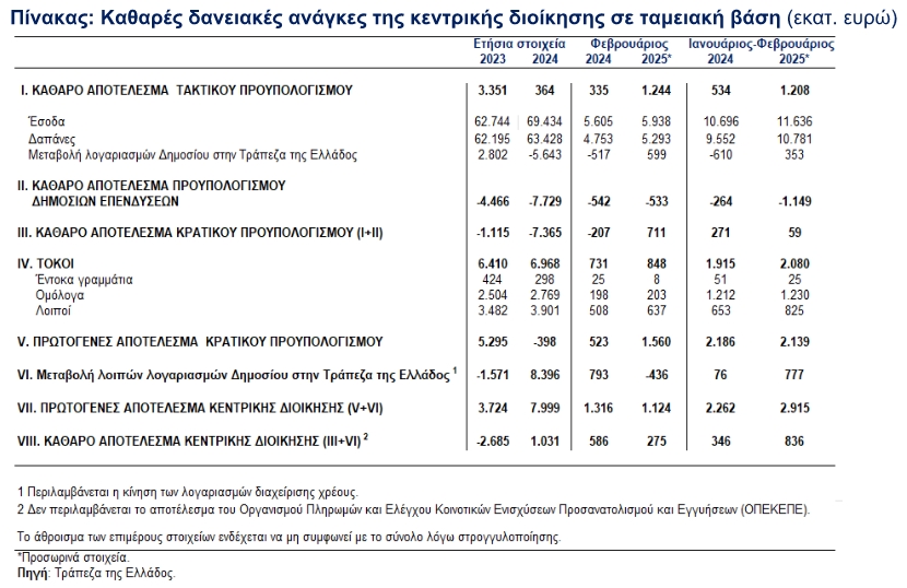 Παράλληλα το ταμειακό αποτέλεσμα της κεντρικής διοίκησης για την ίδια περίοδο Ιανουαρίου-Φεβρουαρίου παρουσίασε πλεόνασμα 836 εκατ. ευρώ, έναντι πλεονάσματος 346 εκατ. ευρώ την αντίστοιχη περίοδο του 2024.