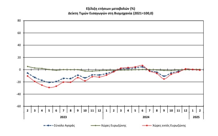 Μείωση 0,5% παρουσίασε ο Γενικός Δείκτης Τιμών Εισαγωγών στη Βιομηχανία τον Φεβρουάριο 2025, σε σύγκριση με τον αντίστοιχο δείκτη Φεβρουαρίου 2024, έναντι μείωσης 2,8% που σημειώθηκε κατά τη σύγκριση των αντίστοιχων δεικτών του έτους 2024 με το 2023.