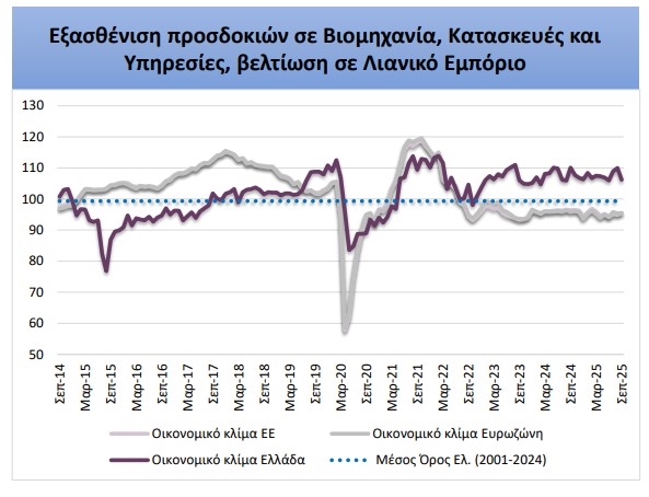 Μικρή επιδείνωση καταγράφηκε για το οικονομικό κλίμα τον Σεπτέμβριο, λόγω εξασθένισης σε Βιομηχανία, Κατασκευές και Υπηρεσίες.