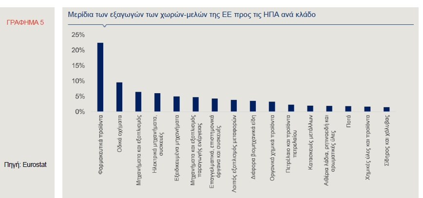 Η προσαρμογή στις νέες συνθήκες είναι αναπόφευκτη, ιδιαίτερα για συγκεκριμένους κλάδους, όπως η φαρμακοβιομηχανία, δεδομένου ότι οι πωλήσεις της στην αγορά των ΗΠΑ αντιπροσωπεύουν μεγάλο ποσοστό των συνολικών της εξαγωγών (Γράφημα 5).