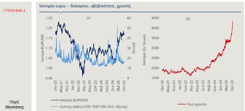 Από την αρχή του έτους, έχει αυξηθεί περίπου κατά 13% έναντι του δολαρίου. Το επενδυτικό κοινό φαίνεται να αμφισβητεί -ως έναν βαθμό- το δολάριο ως "ασφαλές καταφύγιο" στο παγκόσμιο χρηματοπιστωτικό σύστημα. Για τον λόγο αυτό, εξάλλου, η τιμή του χρυσού σημείωσε νέο ιστορικό υψηλό, υπερβαίνοντας τα 4.300 δολάρια ανά ουγγιά (17/10/25), καθώς έχει αυξηθεί η ζήτηση από επενδυτές και κεντρικές τράπεζες εν μέσω αβεβαιότητας (Γράφημα 4β).