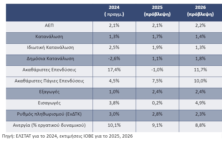 Για το 2026, το ΙΟΒΕ αναθεωρεί προς τα κάτω την εκτίμησή του για ανάπτυξη στο +2,2% (από 2,4%). Αναφορικά με τις συνιστώσες, αναμένουμε διατήρηση της αναπτυξιακής δυναμικής της κατανάλωσης, με ηπιότερο όμως βαθμό καθώς παρά την αξιοσημείωτη αύξηση της δημόσιας κατανάλωσης (+1,8%), η ιδιωτική κατανάλωση προβλέπεται να επιβραδυνθεί σημαντικά (+1,3%). Οι πάγιες επενδύσεις (+10,0%) αναμένεται να ωφεληθούν από ευνοϊκές συνθήκες όπως η επιτάχυνση της υλοποίησης του ΤΑΑ, το χαμηλότερο κόστος χρήματος, και η χρήση των πόρων του ιστορικά υψηλού Προγράμματος Δημοσίων Επενδύσεων. Ωστόσο, ελλοχεύουν κίνδυνοι οι οποίοι απορρέουν από το εξωτερικό περιβάλλον. Το εξωτερικό έλλειμμα, το οποίο ενέχει και διαρθρωτικά χαρακτηριστικά, αναμένεται να διευρυνθεί (εισαγωγές +4,9%, εξαγωγές +2,4%), κυρίως λόγω μιας σειράς διεθνών αβεβαιοτήτων όπως η ενδεχόμενη κλιμάκωση του εμπορικού πολέμου, η πιθανή υποχώρηση της ισοτιμίας ευρώ/δολαρίου λόγω πολιτικοκοινωνικών αναταράξεων σε χώρες του πυρήνα της Ευρωζώνης (όπως η Γαλλία), και η αναστολή της πτωτικής πορείας των επιτοκίων.
