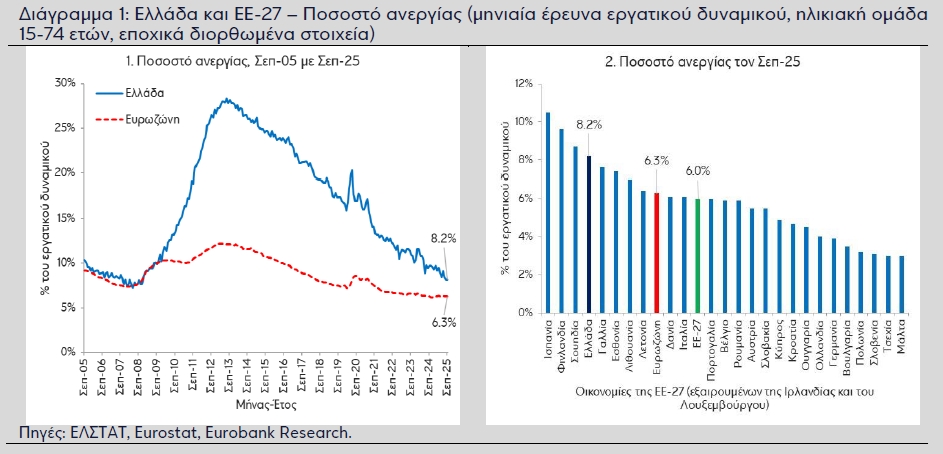 Ειδικότερα, όπως αναφέρει, σύμφωνα με τη μηνιαία έρευνα εργατικού δυναμικού της Ελληνικής Στατιστικής Αρχής (ΕΛΣΤΑΤ), το εποχικά διορθωμένο ποσοστό ανεργίας στην Ελλάδα, ένα μέτρο του βαθμού χρήσης του παραγωγικού συντελεστή της εργασίας, διαμορφώθηκε στο 8,2% του εργατικού δυναμικού τον Σεπ-25, από 9,7% τον Σεπ-24 (βλ. Διάγραμμα 1.1). Σε σύγκριση με τις υπόλοιπες χώρες της ΕΕ-27, εξαιρουμένων της Ιρλανδίας και του Λουξεμβούργου, η Ελλάδα εμφάνισε το 4ο υψηλότερο ποσοστό ανεργίας τον Σεπ-25 (βλ. Διάγραμμα 1.2).