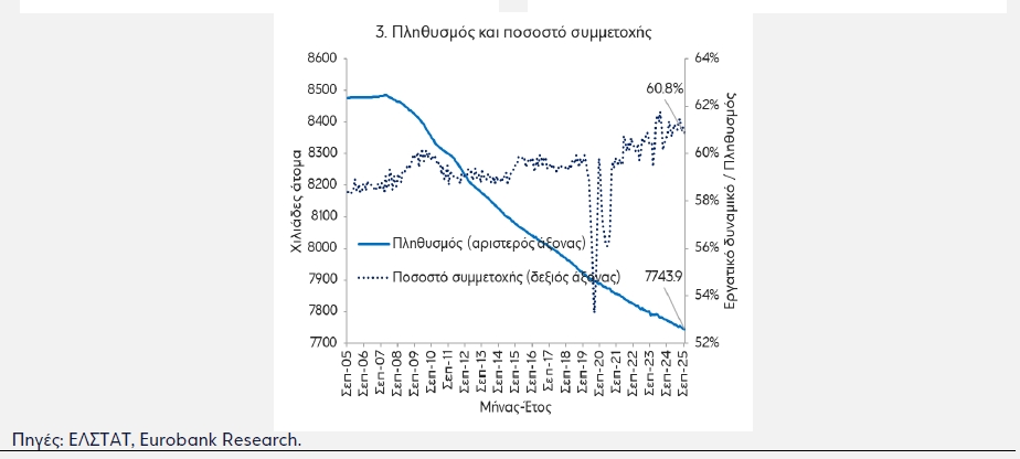 Ένα ενθαρρυντικό στοιχείο είναι ότι μετά την πανδημία η καθοδική τροχιά του εργατικού δυναμικού στην Ελλάδα έχει διακοπεί, ωστόσο δεν έχει αναστραφεί. Αυτό σημαίνει ότι η μείωση του πληθυσμού (βλ. Διάγραμμα 2.3) αποτυπώνεται στη συρρίκνωση της δεξαμενής του μη ενεργού πληθυσμού, δηλαδή των ατόμων που δεν είναι απασχολούμενοι και δεν αναζητούν εργασία. Όπως αναφέραμε σε πρόσφατο τεύχος του δελτίου 7 Ημέρες Οικονομία ("Προκλήσεις για την οικονομία η παραγωγικότητα της εργασίας και το δημογραφικό", τεύχος 551, 15/10/2025), μεσοπρόθεσμα, υπάρχουν διαθέσιμοι πόροι για την περαιτέρω ενίσχυση του παραγωγικού συντελεστή της εργασίας (μακροπρόθεσμα αυτό συναρτάται με τις δημογραφικές τάσεις). Επί παραδείγματι, με το τρέχον εργατικό δυναμικό, αν το ποσοστό ανεργίας στην Ελλάδα ήταν ίσο με το αντίστοιχο στην Ευρωζώνη, η απασχόληση θα ήταν υψηλότερη κατά 88,9 χιλ. άτομα ή κατά 2,1%. Στην περίπτωση αύξησης του εργατικού δυναμικού (μεγαλύτερη συμμε-τοχή των νέων και των γυναικών στο εργατικό δυναμικό, εισροή ανθρώπινου κεφαλαίου από το εξωτερικό που αποχώρησε από την Ελλάδα κατά τη διάρκεια της κρίσης χρέους κ.α.), οι υπάρχουσες δυνατότητες για συνέχιση της ανοδικής πορείας της απασχόλησης διευρύνονται. Ένα θετικό στοιχείο προς αυτή την κατεύθυνση είναι η θετική καθαρή εισερχόμενη μετανάστευση (άτομα με ελληνική υπηκοότητα) που καταγράφηκε το 2023 για πρώτη φορά από το 2009.
