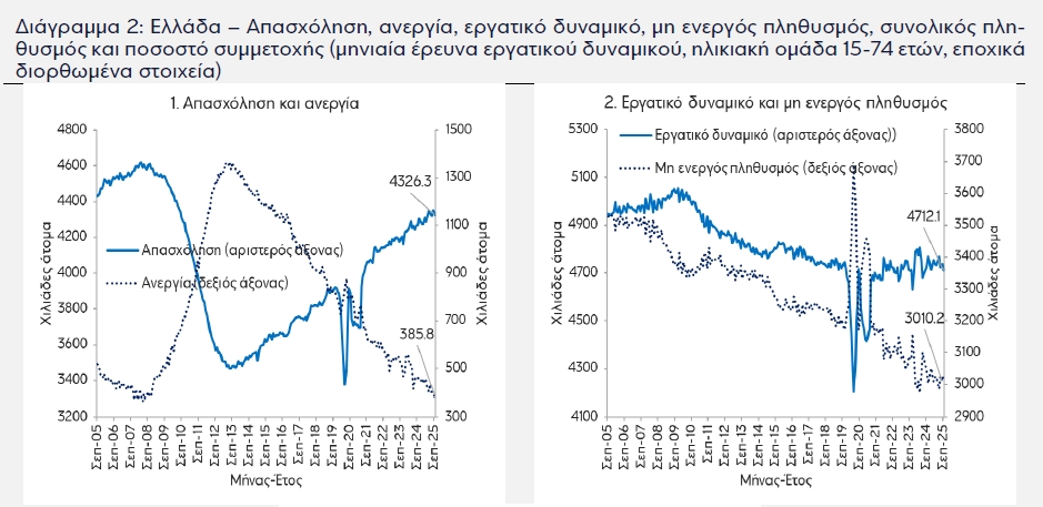 Βάσει της ίδιας έρευνας, ο αριθμός των απασχολούμενων ατόμων στην Ελλάδα τον Σεπ-25 ήταν στα 4.326,3 χιλ. άτομα, καταγράφοντας ετήσια αύξηση 1,4% (59,1 χιλ. άτομα), των ανέργων στα 385,8 χιλ. άτομα (-15,5%, -70,5 χιλ. άτομα), του εργατικού δυναμικού, δηλαδή του αθροίσματος των απα-σχολούμενων και των ανέργων, στα 4.712,1 χιλ. άτομα (-0,2%, -11,4 χιλ. άτομα) και του μη ενεργού πληθυσμού στα 3.031,8 χιλ. άτομα (-0,5%, -15,5 χιλ. άτομα).
