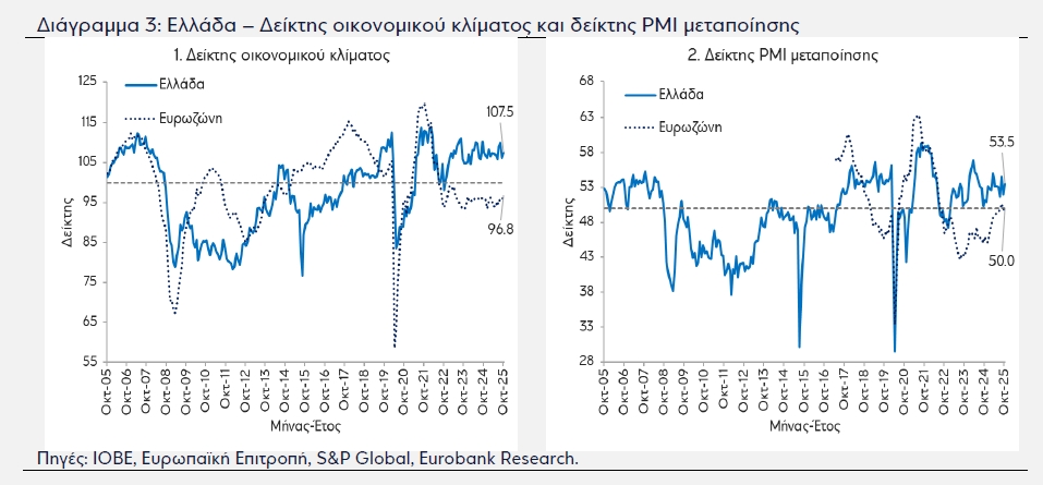 Αναλυτικά, ο δείκτης οικονομικού κλίματος του Ιδρύματος Οικονομικών και Βιομηχανικών Ερευνών (ΙΟΒΕ) ανήλθε στις 107,5 μονάδες, από 106,2 μονάδες τον Σεπ-24, και ο δείκτης PMI μεταποίησης της S&P Global ενισχύθηκε στις 53,5 μονάδες, από 52,0 μονάδες τον Σεπ-25. Η βελτίωση του δείκτη οικονομικού κλίματος προήλθε από τους δείκτες εμπιστοσύνης στη βιομηχανία, τις υπηρεσίες και το λιανικό εμπόριο. Παρά ταύτα, ο δείκτης καταναλωτικής εμπιστοσύνης διατηρήθηκε σε έντονα αρνητικό έδαφος (περισσότερες αρνητικές απαντήσεις στα ερωτήματα της έρευνας απ’ ό,τι θετικές). Η ενίσχυση του δείκτη PMI μεταποίησης αντανακλά την αύξηση της εγχώριας ζήτησης (και όχι της ζήτησης από την αλλοδαπή) η οποία πυροδότησε την άνοδο των νέων παραγγελιών, της παραγωγής και της απασχόλησης των επιχειρήσεων που συμμετείχαν στην έρευνα.