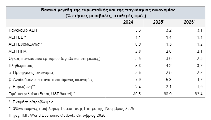 To 2026 η ελληνική οικονομία εκτιμάται ότι θα συνεχίσει με την ίδια δυναμική ανάπτυξης σε ένα διεθνές περιβάλλον που εξακολουθεί να διέπεται από γεωπολιτική αβεβαιότητα, μεταβαλλόμενες συνθήκες στο παγκόσμιο εμπόριο και στις αγορές ενέργειας καθώς και από κινδύνους για τη δημοσιονομική και πολιτική σταθερότητα σε μεγάλες ευρωπαϊκές οικονομίες.