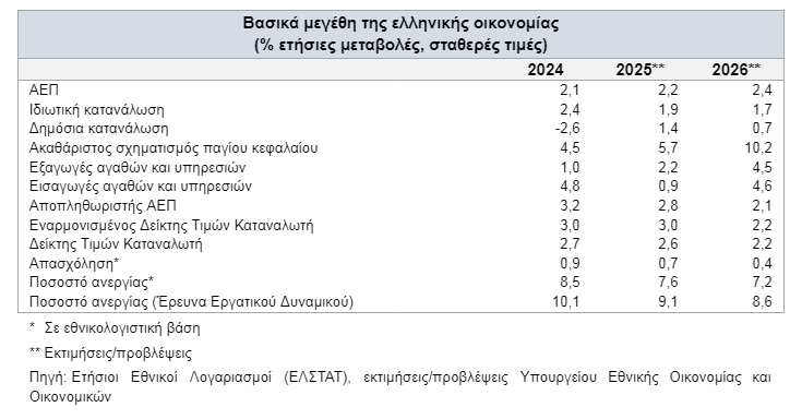 Παρά την αβεβαιότητα στο παγκόσμιο οικονομικό περιβάλλον, η ελληνική οικονομία προβλέπεται να συνεχίσει για έκτο συναπτό έτος να καταγράφει σημαντικά υψηλότερο ρυθμό πραγματικής ανάπτυξης σε σχέση με τον μέσο όρο της Ευρωζώνης. Ο ρυθμός ανάπτυξης αναμένεται να ανέλθει σε 2,2% το 2025 και 2,4% το 2026, έναντι 1,3% και 1,2% για την Ευρωζώνη αντίστοιχα. Το ονομαστικό ΑΕΠ αναμένεται να αυξηθεί από τα 248,7 δισ. ευρώ το 2025 σε 260 δισ. ευρώ το 2026. Παράλληλα, ο εγχώριος πληθωρισμός αναμένεται να αποκλιμακωθεί από 2,6% το 2025 σε 2,2% το 2026.