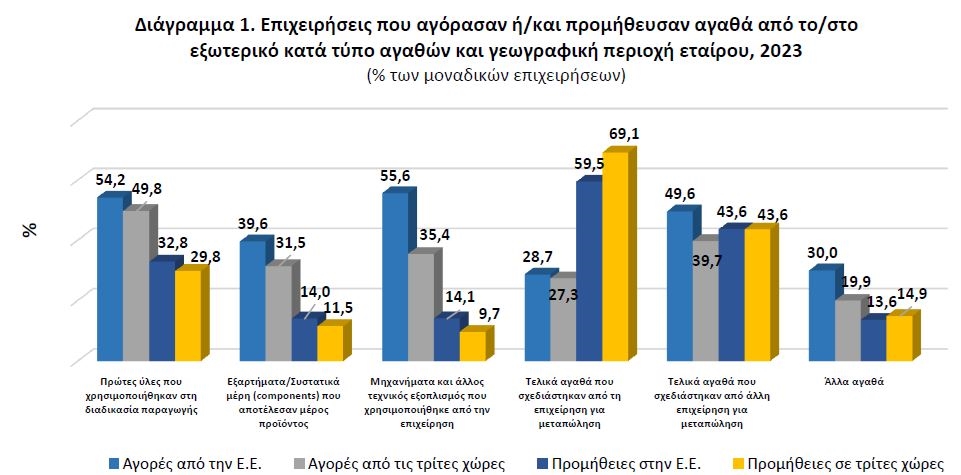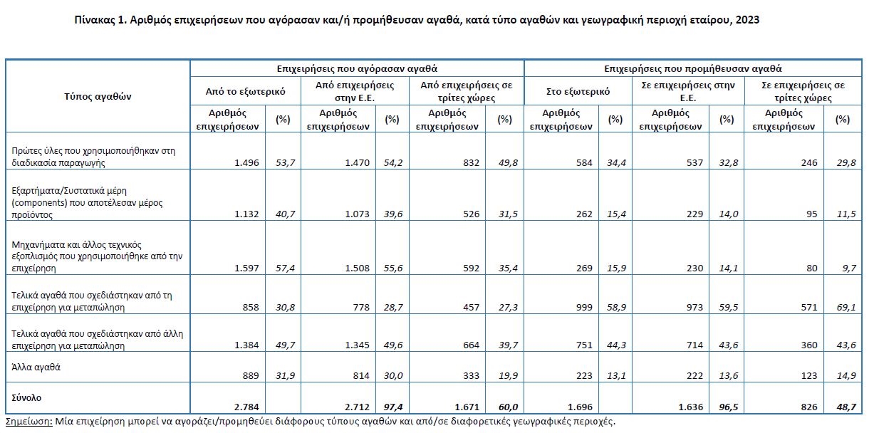 Σύμφωνα με την έρευνα, το 2023, το 55,2% (2.784 επιχειρήσεις) του συνολικού πληθυσμού των επιχειρήσεων που ανήκουν στους τομείς οικονομικής δραστηριότητας Β έως Ν της NACE Αναθ.2 και απασχολούν 50 ή περισσότερους εργαζομένους (5.044 επιχειρήσεις) προμηθεύτηκε αγαθά από το εξωτερικό. Το 97,4% των επιχειρήσεων αγόρασε αγαθά από χώρες της Ε.Ε. και το 60,0% από τρίτες χώρες. Η Ευρωπαϊκή Ένωση αποτέλεσε την προτιμώμενη αγορά προμηθειών για όλους τους τύπους αγαθών, ενώ οι κατηγορίες αγαθών που προμηθεύονταν περισσότερο οι επιχειρήσεις από την αγορά της Ε.Ε. ήταν τα "Μηχανήματα και άλλος τεχνικός εξοπλισμός " και οι "Πρώτες ύλες" (Πίνακας 1 – Διάγραμμα 1).
