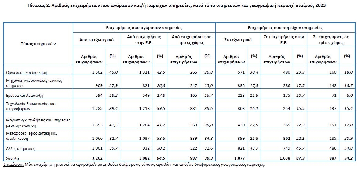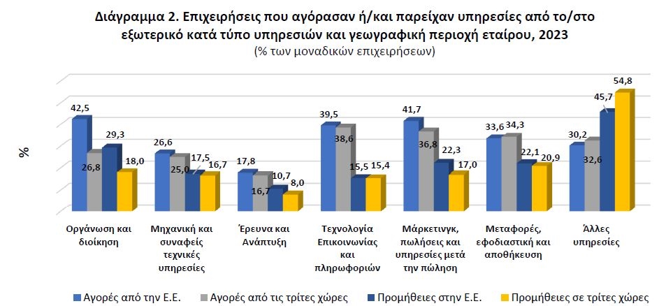 Όσον αφορά στις υπηρεσίες, το 2023, το 64,7% (3.262 επιχειρήσεις) του συνολικού πληθυσμού των επιχειρήσεων που ανήκουν στους τομείς οικονομικής δραστηριότητας Β έως Ν της NACE Αναθ. 2 και απασχολούν 50 ή περισσότερους εργαζομένους (5.044 επιχειρήσεις), προμηθεύτηκε υπηρεσίες από το εξωτερικό. Το 94,5% των επιχειρήσεων προμηθεύτηκε υπηρεσίες από χώρες της Ε.Ε. και το 30,3% από τρίτες χώρες. Οι κατηγορίες υπηρεσιών "Οργάνωση και Διοίκηση", "Μάρκετινγκ, πωλήσεις και υπηρεσίες μετά την πώληση" και "Τεχνολογίες Πληροφορικής και Επικοινωνιών (ΤΠΕ)" παρασχέθηκαν στο 46,0%, 41,5% και 39,4% των επιχειρήσεων αντίστοιχα από επιχειρήσεις του εξωτερικού (Διάγραμμα 2 - Πίνακας 2).