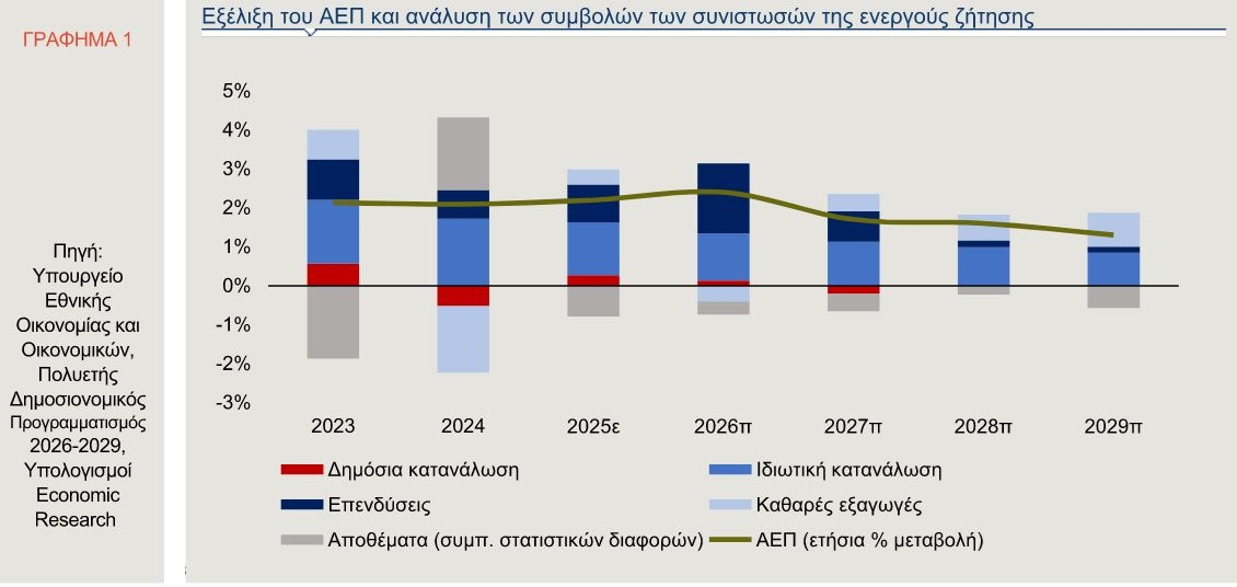 Παράλληλα, η ιδιωτική κατανάλωση θα συνεχίσει να αυξάνεται, επωφελούμενη, μεταξύ άλλων, από τις δημοσιονομικές παρεμβάσεις για την ενίσχυση του διαθέσιμου εισοδήματος που προβλέπονται στον Προϋπολογισμό του 2026 και την αναμενόμενη αύξηση του κατώτατου μισθού τον Απρίλιο του νέου έτους.