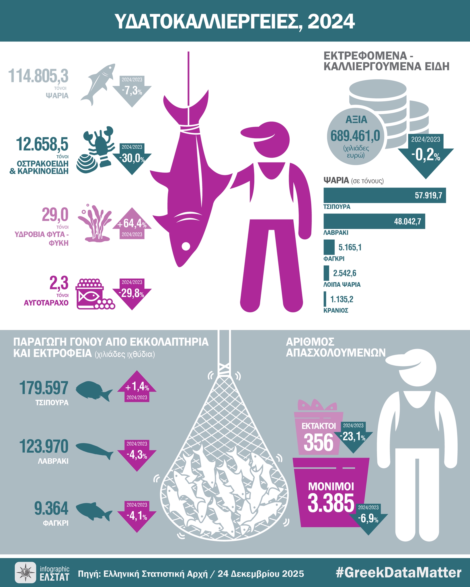 Ειδικότερα, η συνολική παραγωγή και η αξία των εκτρεφόμενων – καλλιεργούμενων ειδών υδατοκαλλιέργειας της Χώρας παρουσίασαν μείωση κατά 10,2% και 0,2% αντίστοιχα, το έτος 2024 σε σχέση με το 2023.