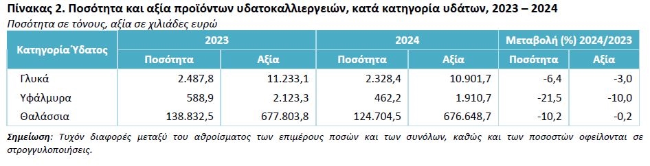 Θαλάσσια ύδατα: η ποσότητα και η αξία παρουσίασαν μείωση 10,2% και 0,2% αντίστοιχα, το 2024 σε σχέση με το 2023. Συγκεκριμένα, το 2024 καλλιεργήθηκαν 124.704,5 τόνοι συνολικής αξίας 676.648,7 χιλ. ευρώ, έναντι 138.832,5 τόνων συνολικής αξίας 677.803,8 χιλ. ευρώ το 2023.