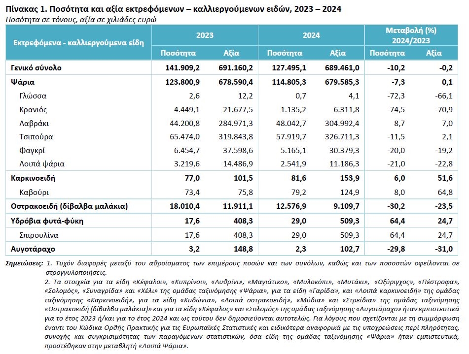 Ψάρια: η ποσότητα και η αξία παρουσίασαν μείωση κατά 7,3% και αύξηση 0,1% αντίστοιχα, το έτος 2024 σε σχέση με το 2023. Συγκεκριμένα, το 2024 εκτράφηκαν 114.805,3 τόνοι συνολικής αξίας 679.585,3 χιλ. ευρώ, έναντι 123.800,9 τόνων συνολικής αξίας 678.590,4 χιλ. ευρώ το 2023.