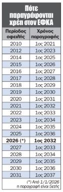 - Η αξίωση του e-ΕΦΚΑ για την είσπραξη οφειλής από εισφορές των μηνών 1/2026 έως και 12/2026 παραγράφεται 1/1/2032.