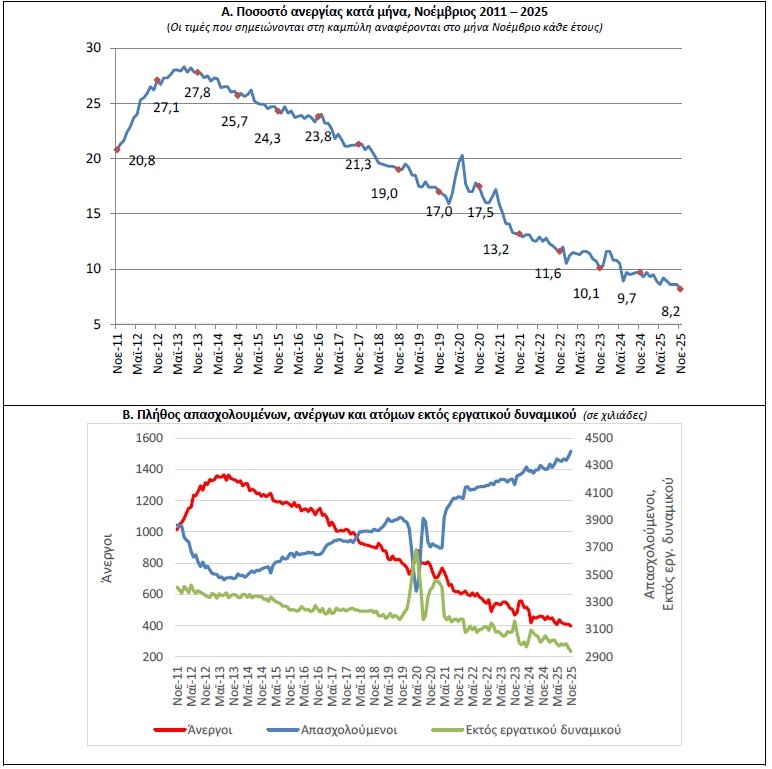 • Το εποχικά διορθωμένο ποσοστό ανεργίας τον Νοέμβριο του 2025 ανήλθε σε 8,2% έναντι του αναθεωρημένου προς τα πάνω 9,7% τον Νοέμβριο του 2024, και 8,6% τον Οκτώβριο του 2025.