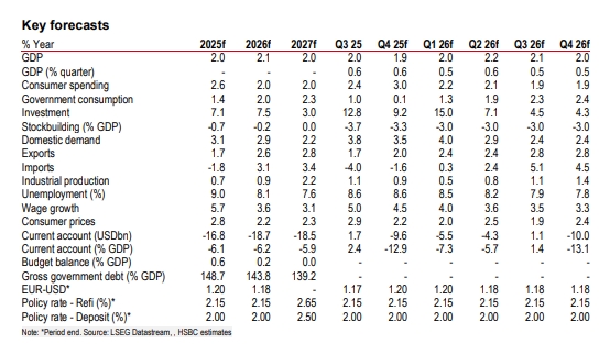 Η HSBC εκτιμά πως η ανάπτυξη στην Ελλάδα θα διαμορφωθεί στο 2% στο σύνολο του 2025, από 2,2% που προέβλεπε πριν, ενώ φέτος θα κινηθεί 2,1% και το 2027 στο 2,0%, υποστηριζόμενη από την ταχύτερη εφαρμογή του RRF (ακόμα και μετά την προθεσμία του τέλους του 2026). Η Ελλάδα επομένως θα συνεχίσει τη μακρά διαδικασία κάλυψης της υστέρησης που ξεκίνησε το 2018, με το πραγματικό ΑΕΠ να αναμένεται να επιστρέψει το 2027 σχεδόν στο επίπεδο του 2010, όπως τονίζει, δηλαδή πριν το πρώτο μνημόνιο.