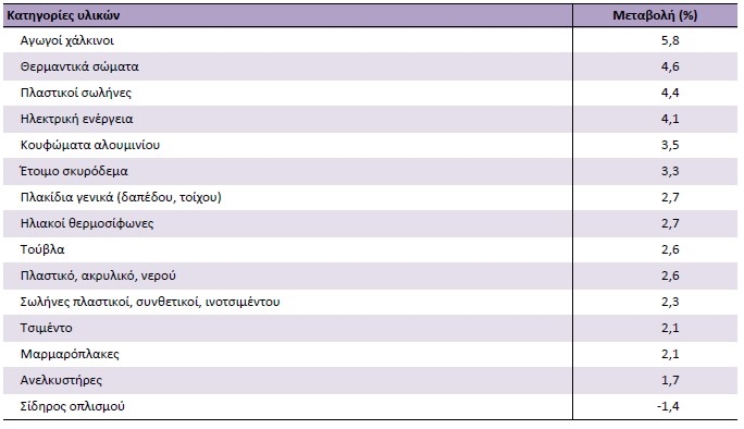 Στις επιμέρους καταγορίες υλικών οι μεταβολές διαμορφώθηκαν ως εξής: