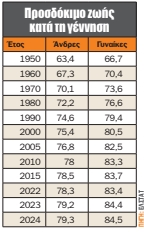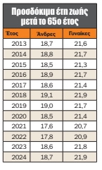 Η τελευταία αξιολόγηση ήταν για τη δεκαετία 2024-2013, που έδειξε ότι το προσδόκιμο ζωής άνω των 65 ετών ουσιαστικά έμεινε αμετάβλητο. Στους άνδρες παρέμεινε στο 18,7 το 2024 σε σχέση με το 2013, ενώ στις γυναίκες αυξήθηκε οριακά στα 21,9 έτη το 2024, από 21,6 έτη που ήταν το 2013.