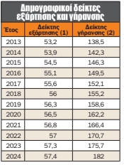 Η αύξηση του δείκτη εξάρτησης ασκεί πιέσεις στο ασφαλιστικό σύστημα, στην αγορά εργασίας και στα δημόσια οικονομικά, καθώς μειώνεται η αναλογία εργαζομένων προς συνταξιούχους. Παράλληλα, η εκρηκτική άνοδος του δείκτη γήρανσης αποκαλύπτει τη συρρίκνωση των νεότερων ηλικιακών ομάδων, αποτέλεσμα χαμηλής γεννητικότητας και μετανάστευσης νέων. Συνολικά, τα στοιχεία καταδεικνύουν ότι το δημογραφικό πρόβλημα της Ελλάδας δεν είναι συγκυριακό, αλλά διαρθρωτικό, απαιτώντας μακροπρόθεσμες πολιτικές στήριξης της οικογένειας, ενίσχυσης της απασχόλησης και προσέλκυσης νεότερου πληθυσμού.