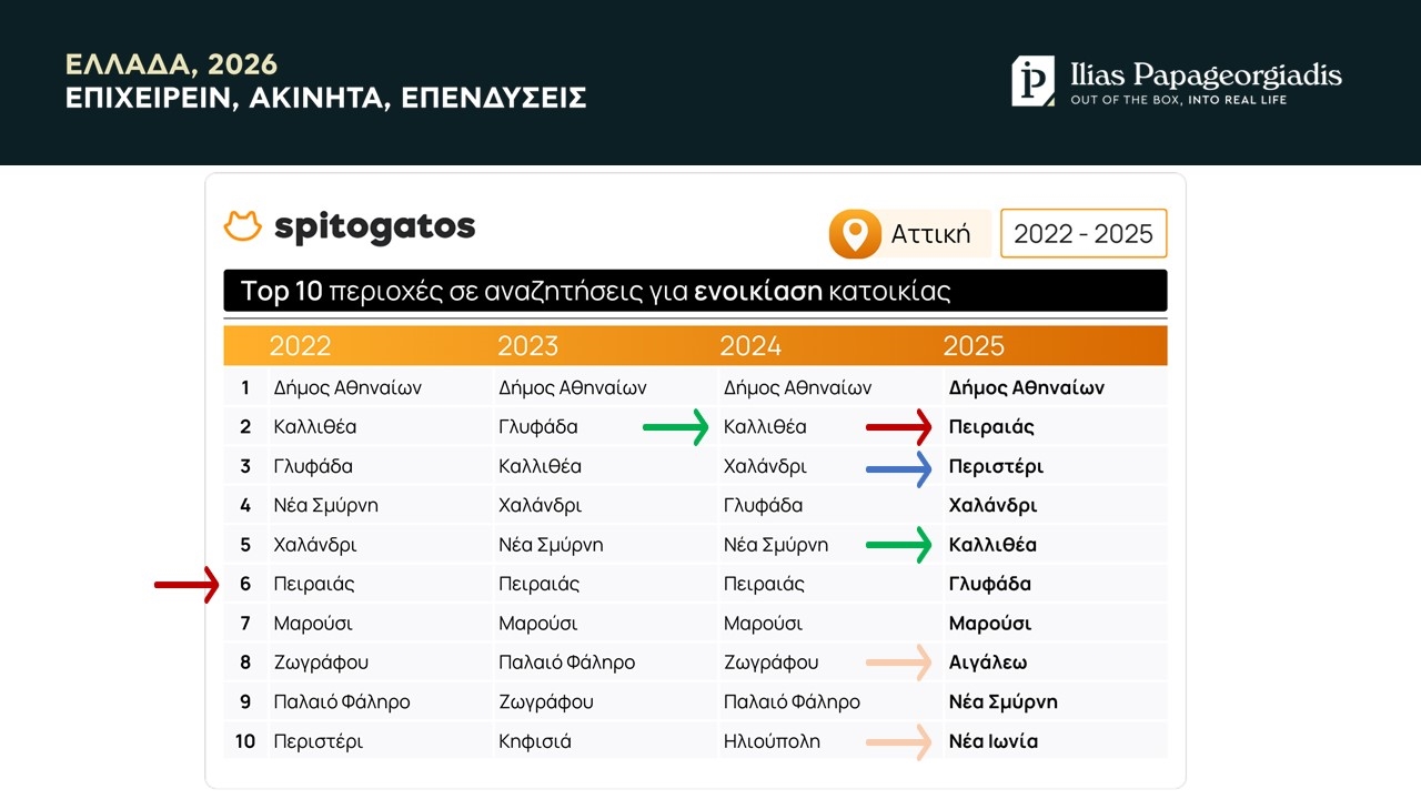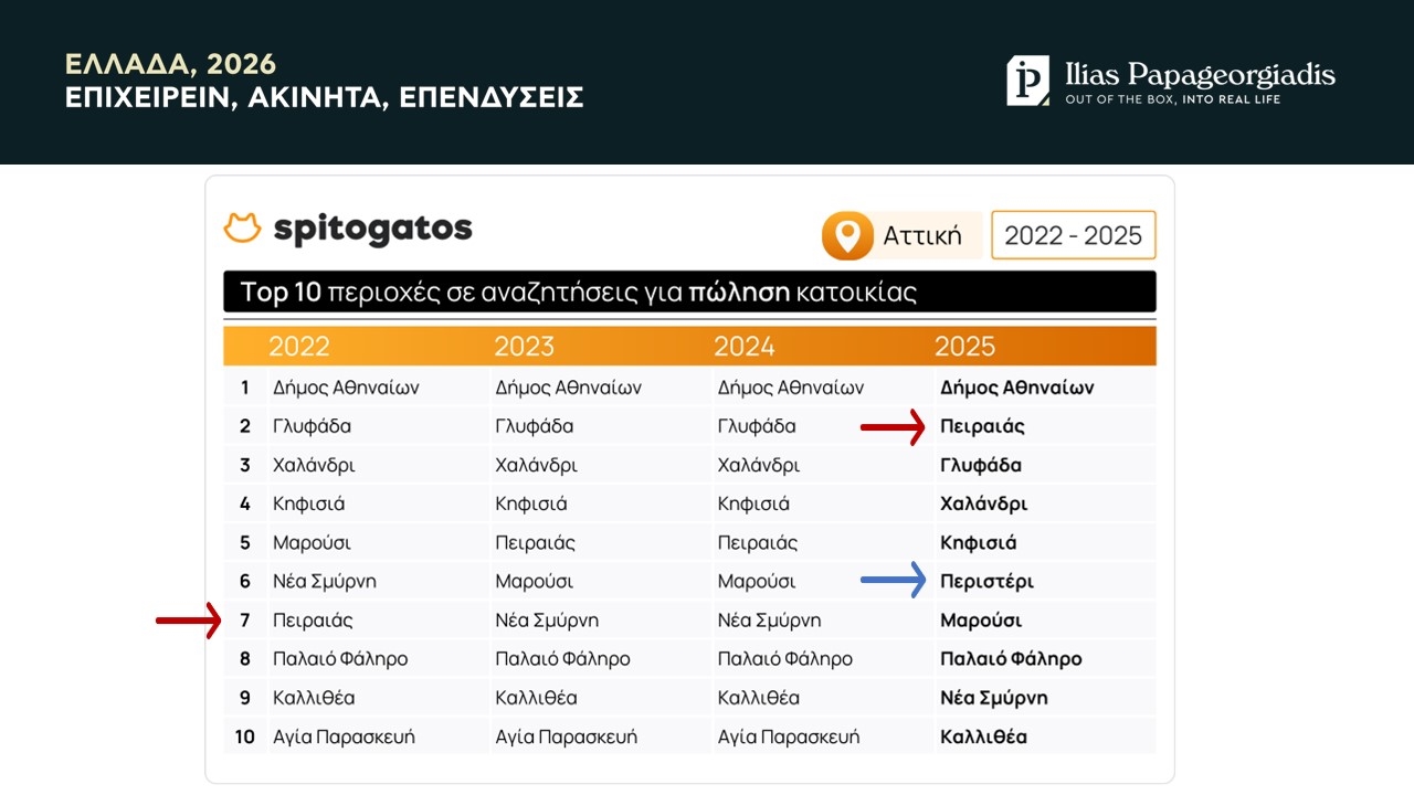 Ασφαλώς, σε ό,τι αφορά τις αναζητήσεις για αγορά κατοικίας, ο Δήμος Αθηναίων εξακολουθεί να βρίσκεται στην κορυφή, κάτι που δύσκολα θα αλλάξει στο μέλλον, λόγω του πλήθους των διαθέσιμων ακινήτων. Αντίστοιχα, η περιοχή της Γλυφάδας συνεχίζει να πρωταγωνιστεί, καθώς βρίσκεται στην τρίτη θέση (από την δεύτερη του 2024). Στα βόρεια προάστια, το Χαλάνδρι εξακολουθεί να πρωταγωνιστεί και βρέθηκε στην τέταρτη θέση το 2025, από την τρίτη που ήταν την περίοδο 2022-2024. Το 2025, την πρώτη δεκάδα συμπλήρωσαν περιοχές, όπως η Κηφισιά, το Μαρούσι, το Παλαιό Φάληρο, η Νέα Σμύρνη και η Καλλιθέα.