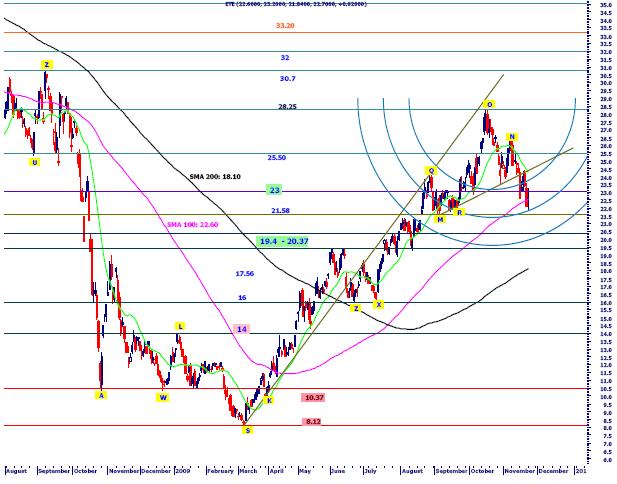 «Στο ημερήσιο διάγραμμα τιμών βλέπουμε τη τιμή της μετοχής να επανέρχεται μετά από την αρνητική συνεδρίαση της Παρασκευής πάνω από το μεσοπρόθεσμο απλό κινητό μέσο των 100 ημερών πραγματοποιώντας ένα ‘μεγαλοπρεπές’ Doji με το κυρίως σώμα να εντοπίζεται σχεδόν στο μέσο του προηγούμενου μαύρου candlestick. Η πιθανή τώρα διατήρηση, σε επίπεδο κλεισίματος, της περιοχής των 22,3 με 22,7 ευρώ θα βάλει τις βάσεις για μια ανοδική ανάταση προς τη γραμμή αντίστασης MR στα 24,5 ευρώ περίπου. Ιδιαίτερα θετική σε βραχυχρόνιο επίπεδο θα θεωρηθεί και η άρνηση της μετοχής να διαφύγει καθοδικά κάτω από το δεύτερο διορθωτικό Fibonacci τόξο (21,74€) του τελευταίου ανοδικού κύματος XO. Τέλος, παρά τις σημαντικές απώλειες της τάξεως του 22,7% από τα υψηλά των 28,25€ η μεσομακροπρόθεσμη τάση παραμένει άκρως θετική, καθώς οι περισσότεροι αργοί ταλαντωτές παραμένουν αγορασμένοι από τα 11,4 ευρώ, ενώ η τελευταία διορθωτική κίνηση της μετοχής δεν έχει καν αγγίξει το 38,2% επίπεδο των Fibonacci Retracement (20,5€) της ισχυρής ανοδικής κίνησης του περασμένου Μαρτίου SO», αναφέρει η Fortius.