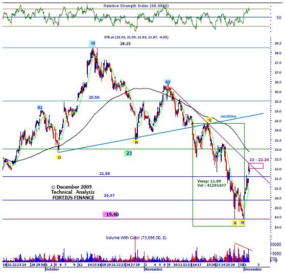 «Επίσης λίγο πιο χαμηλά στα 21,99 ευρώ βρίσκεται το Vwap της μετοχής, όπως αυτό διαμορφώθηκε στη τελευταία καθοδική κίνηση (16 /11 με 30 /11), που πραγματοποιήθηκε μετά τη διάσπαση της neckline ΟΝ του σχηματισμού Head and Shoulders S1 H S2. Μάλιστα το εν λόγω επίπεδο θα παίξει καθοριστικό ρόλο στη μετέπειτα πορεία της μετοχής της Εθνικής Τράπεζας, καθώς εμπεριέχει 41,3 εκατ. τεμάχια. Πιθανή τώρα καταστρατήγηση με αυξημένο όγκο συναλλαγών της περιοχής των 22,20 ευρώ θα βάλει τα θεμέλια για τη δημιουργία ανοδικού βατήρα, όπου θα έχει ως στόχο την επανείσοδο της μετοχής στη ζώνη 23 με 24,4 ευρώ. Αντιθέτως αδυναμία διαφυγής θα εντείνει την υπάρχουσα ανησυχία για την ποιότητα της τελευταίας ανοδικής κίνησης», αναφέρει η Fortius.