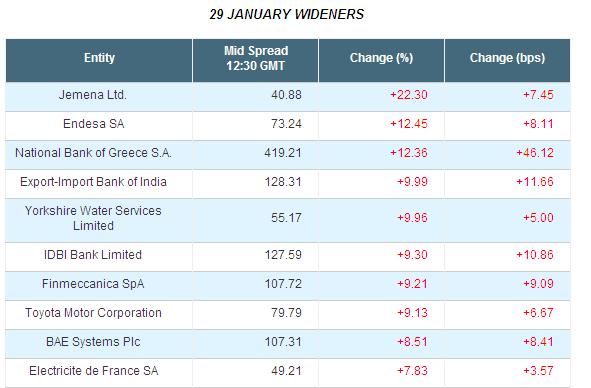 Σύμφωνα με στοιχεία της CMA, το spread του CDS της Εθνικής Τράπεζας εμφανίζει σήμερα, 29 Ιανουαρίου, την τρίτη μεγαλύτερη αύξηση μετά τις Jemena Ltd. και Endesa SA.