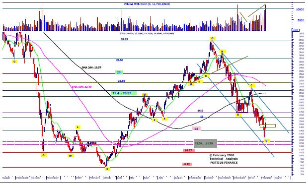 "Εκπληκτικός ήταν ο συνολικός όγκος συναλλαγών, καθώς ξεπέρασε κατά πολύ τα 11 εκατ. τεμάχια παίρνοντας έτσι τη δεύτερη θέση μετά το καθοδικό crescendo της 9ης Δεκεμβρίου του 2009. Ενδιαφέρον παρουσιάζει η ανάλυση του διαμορφωθέντος Vwap (15,43€ με 108,4 εκατ. τεμ.) του τελευταίου βραχυχρόνιου καθοδικού κύματος (κορυφή C : 20,83€ έως και τη χθεσινή ημέρα) καθώς βρίσκεται πολύ χαμηλότερα από το μέσο της κίνησης, γεγονός, που μας προβληματίζει ιδιαίτερα για την περαιτέρω πορεία της μετοχής. Χαρακτηριστική είναι και η «ακτινογραφία» της μετοχής (Market Profile CBOT), όπου διαφαίνεται η έντονα καθοδική ρευστοποίηση της μετοχής από τα 17,10 ευρώ και κάτω", αναφέρει η Fortius.