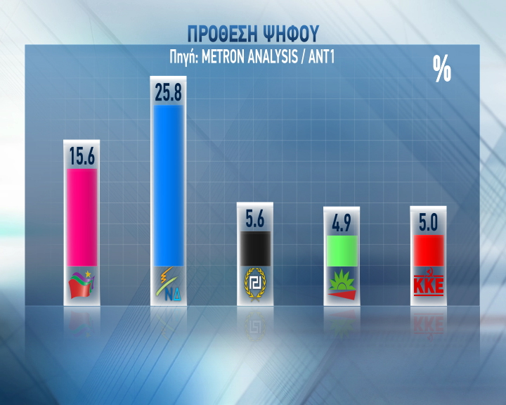 Με 10.2% προηγείται στην πρόθεση ψήφου η ΝΔ του ΣΥΡΙΖΑ, σύμφωνα με τα στοιχεία της δημοσκόπησης της Metron Analysis για λογαριασμό του ΑΝΤ1.