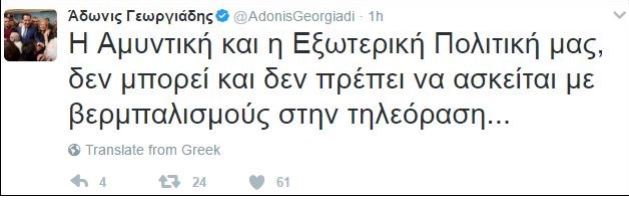 Με μήνυμα του στο twitter, ο Άδωνις Γεωργιάδης σχολίασε τις δηλώσεις του υπουργού Άμυνας, Πάνου Καμμένου με τις οποίες απάντησε στον Τούρκο ΥΠΕΞ, Mevlut Cavusoglu.