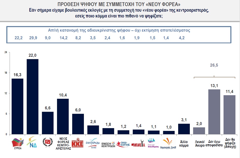 Έκπληξη είναι τα αποτελέσματα της δημοσκόπησης αν σε αυτή συμπεριληφθεί το νέο κόμμα της Κεντροαριστεράς. Στην περίπτωση αυτή ο νέος φορέας λαμβάνει 10,4%, ο ΣΥΡΙΖΑ 16,3%, η Νέα Δημοκρατία 22%, η Χρυσή Αυγή 6,6%, το ΚΚΕ 6%, τα άλλα κόμματα είναι κάτω από το 3% ενώ η αδιευκρίνιστη ψήφος φτάνει το 26,5%.