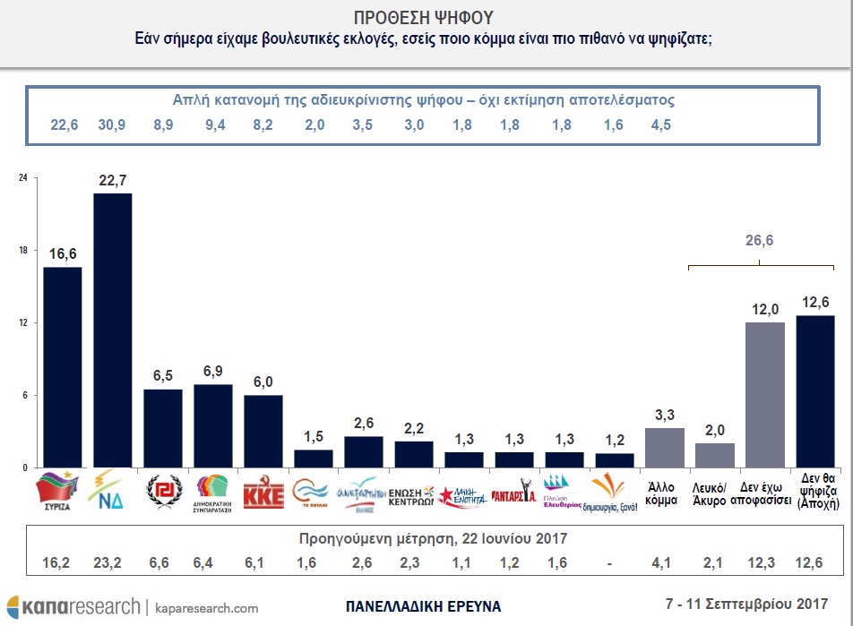 Πολύ ενδιαφέρουσα έκπληξη για τον νέο φορέα της Κεντροαριστεράς παρουσιάζουν τα στοιχεία της δημοσκόπησης που πραγματοποίησε η ΚΑΠΑ Research το διάστημα ανάμεσα στις 7 και 11 Σεπτεμβρίου, σύμφωνα με τα οποία η Νέα Δημοκρατία διατηρεί το προβάδισμά της.