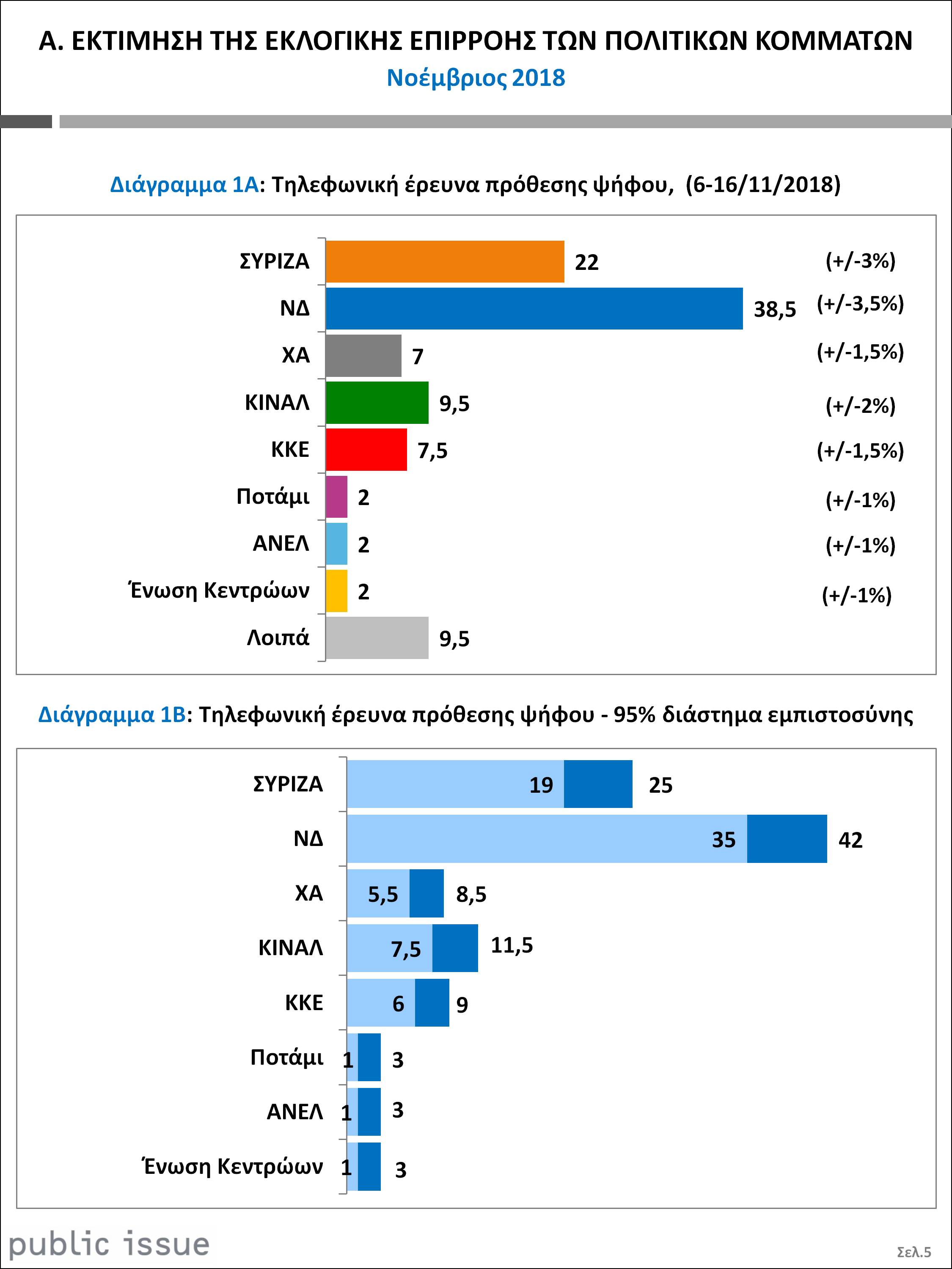 Προβάδισμα της τάξης του 16,5% έναντι του ΣΥΡΙΖΑ εμφανίζει η ΝΔ, σύμφωνα με την Εκτίμηση Εκλογικής Επιρροής Φθινοπώρου 2018 της Public Issue, με το Κίνημα Αλλαγής να εμφανίζει αυξημένη συσπείρωση και να κινείται προς τη σφαίρα του διψήφιου ποσοστού.