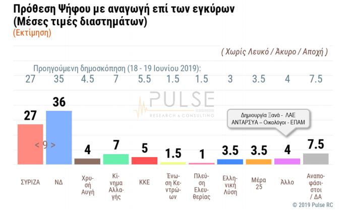 Η ΝΔ κινείται στο 36%, έναντι 27% του ΣΥΡΙΖΑ, με τρίτο κόμμα το Κίνημα Αλλαγής, με 7%, ενώ ακολουθεί το ΚΚΕ με 5%, η "Χρυσή Αυγή" με 4%, ενώ το ΜέΡΑ25 του Γιάνη Βαρουφάκη και η Ελληνική Λύση του Κυριάκου Βελόπουλου εμφανίζονται στο 3,5%.