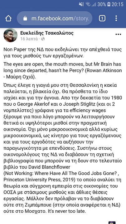 (Not Working: Where Have All The Good Jobs Gone? , Princeton University Press, 2019) το οποίο αναλύει τη θεωρία και σύγχρονη εμπειρία στις οικονομίες του ΟΟΣΑ με στάσιμους μισθούς και άθλιες θέσεις εργασίας. Μάλλον δεν πρόλαβαν να το διαβάσουν ούτε στη Ζιμπάμπουε (στην οποία αναφέρεται η ΝΔ) ούτε στο Μοσχατο. It's never too late.