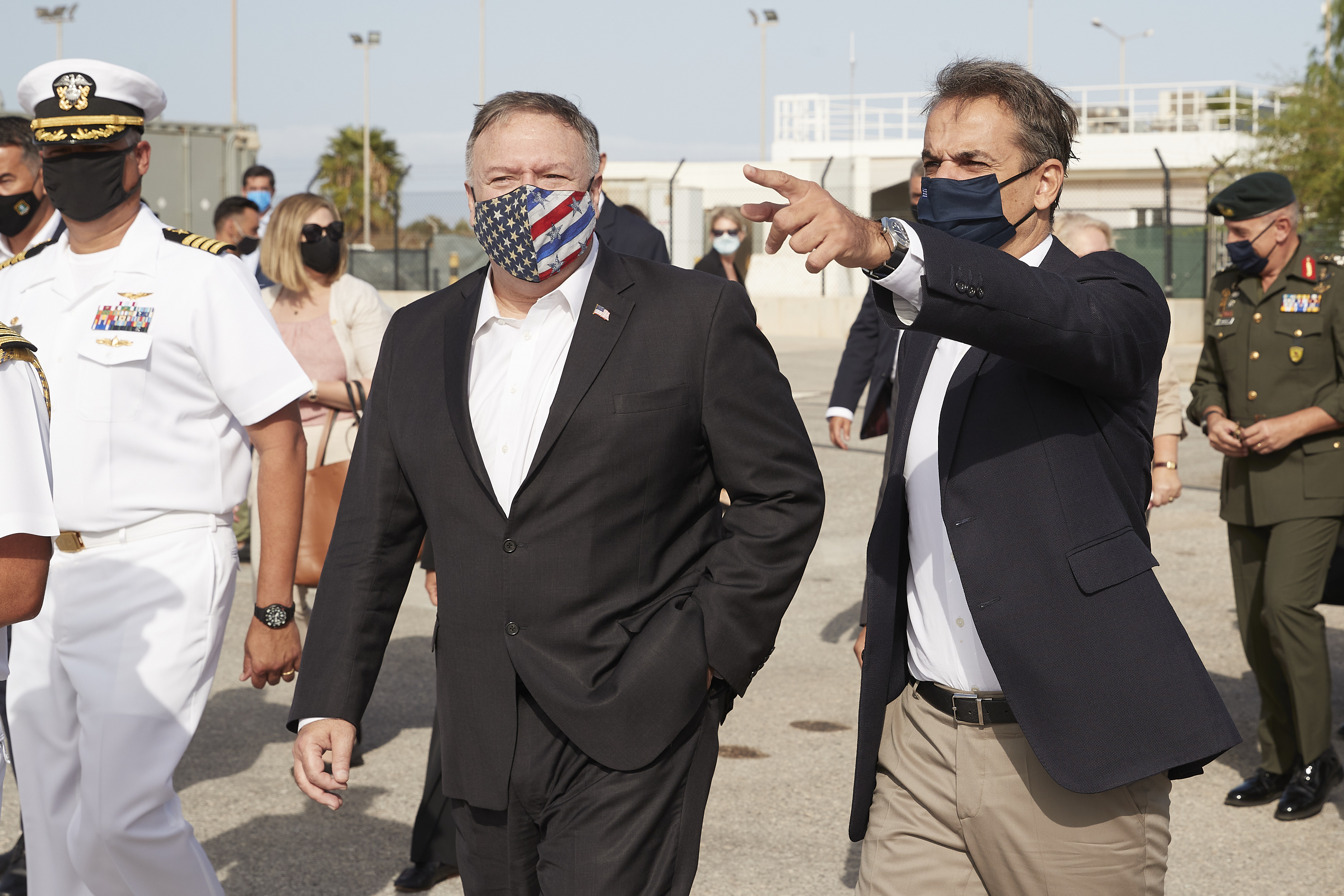 Οι κύριοι Μητσοτάκης και Πομπέο πραγματοποίησαν το πρωί κοινή επίσκεψη στη στρατιωτική βάση της Σούδας στην Κρήτη. Ενημερώθηκαν για τη λειτουργία της και στη συνέχεια επιβιβάστηκαν στην ελληνική Φρεγάτα ΜΕΚΟ "Σαλαμίς" και στα αμερικανικά ταχύπλοα σκάφη CCM (Combat Craft Medium) που βρίσκονται στη ναυτική βάση στο Μαράθι. Ακολούθησε διευρυμένη συνάντηση στην 115 Πτέρυγας Μάχης. Τους κυρίους Μητσοτάκη και Πομπέο υποδέχθηκαν στις 10.00 το πρωί εκπρόσωποι από την στρατιωτική ηγεσία των δύο βάσεων και έγινε ενημέρωση στην πίστα της αμερικανικής βάσης (NSA), παρουσία του υπουργού Εξωτερικών Νίκου Δένδια, του υπουργού Άμυνας, Νίκου Παναγιωτόπουλου, του αρχηγού ΓΕΕΘΑ, Κωνσταντίνου Φλώρου και της διευθύντριας του διπλωματικού γραφείου του πρωθυπουργού, Ελένης Σουρανή. Παρόντες από την αμερικανική πλευρά ήταν ο πρέσβης των ΗΠΑ στην Ελλάδα, Τζέφρυ Πάιατ και ανώτεροι αξιωματικοί των ΗΠΑ.